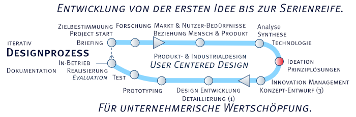 Briefing, Beratung und Lastenheft / Designstrategie / Ideation / Vorstudien / Konzept-Kreation / Konzept Design-Definition, Konzept-Detaillierung / CAD und Prototyping von Produkten & Modelle / Schutz des Designs, eingetragene Schutzrechte / 3D/CAD-Engineering/Design / Konzept-Umsetzung / Kommunikation
