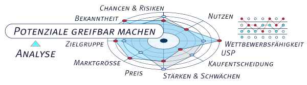 Die Potenzialanalyse ist unser wichtiges Werkzeug für strategische Planung. Dies hilft, das Potenzial von Produkten und einer Marke zu erkennen und auszuschöpfen. Daraus ergeben sich die Strategie für die Umsetzung.